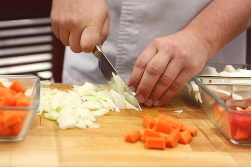 Marchewkę, selera, pietruszkę i paprykę pokrój w kostkę. Cebulę posiekaj na drobną kosteczkę. Czosnek rozgnieć na miazgę.
