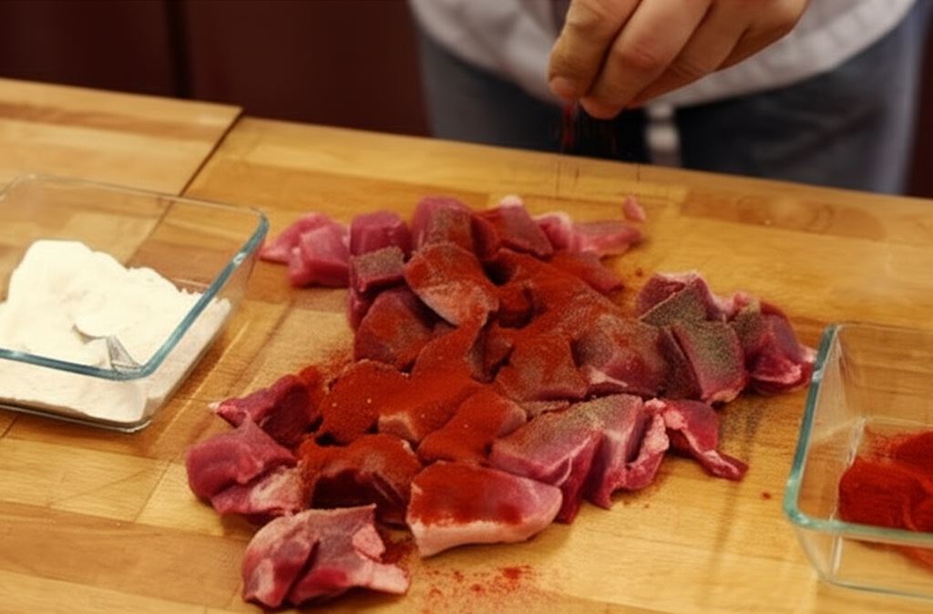 Mięso potnij na duże kawałki o wielkości 2 centymetrów, dopraw przyprawą do mięsa Knorr, pieprzem, ostrą papryką, po czym obsyp mąką.