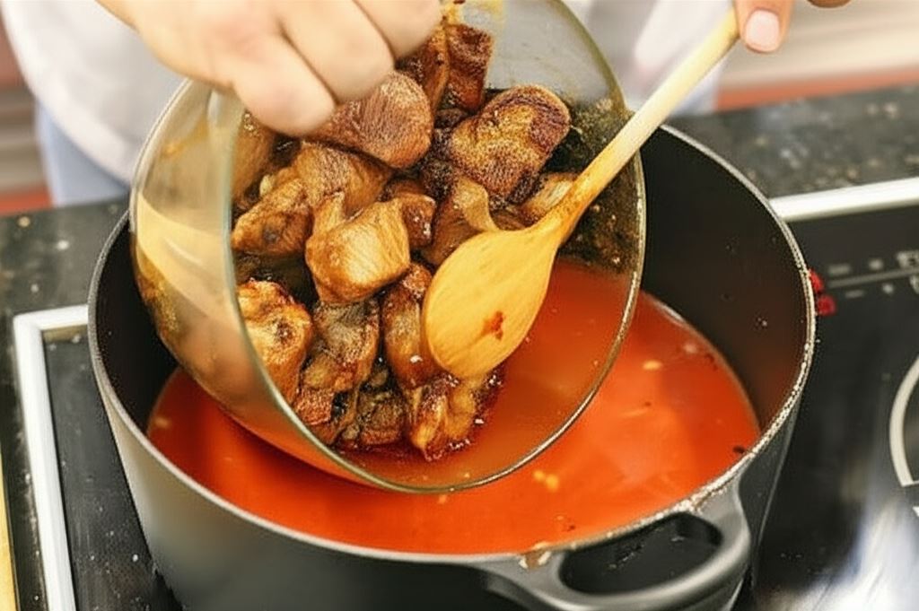 Dodaj koncentrat pomidorowy, smaż aż do chwili, gdy koncentrat zacznie przywierać do dna garnka. Następnie wlej 1 litry wody, włóż z powrotem mięso oraz ziele angielskie, liście laurowe i majeranek.