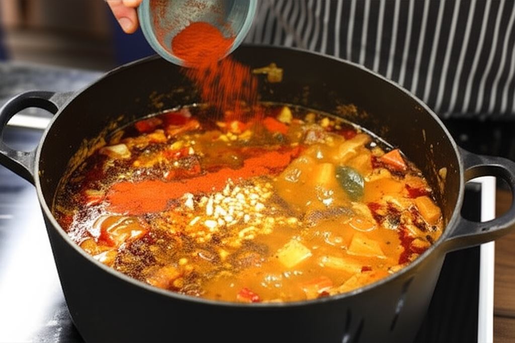 Po tym czasie dodaj do gulaszu czerwoną paprykę i gotuj przez kolejne 20 minut, aż mięso stanie się miękkie. Następnie wsyp pozostałe przyprawy: kminek, ostrą paprykę oraz roztarty czosnek.