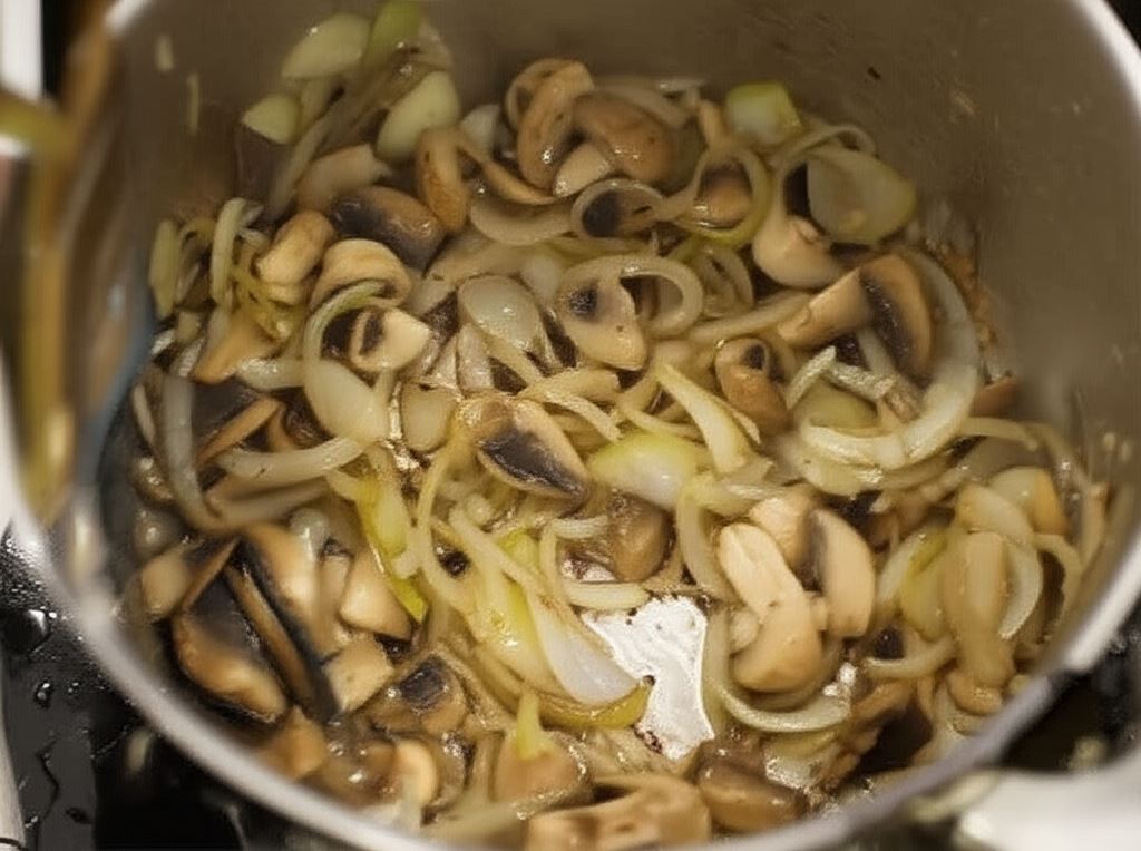 Cebulę posiekaj w piórka i przysmaż w tym samym garnku. W międzyczasie pokrój pieczarki na połówki lub ćwiartki i dorzuć do cebuli – smaż wspólnie na silnym ogniu.