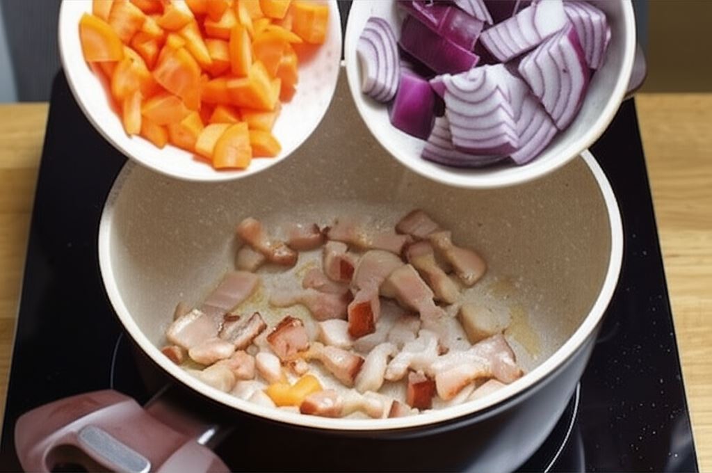 Boczek, marchewkę i cebulę pokrój w kosteczkę, zrumień w garnku na maśle.