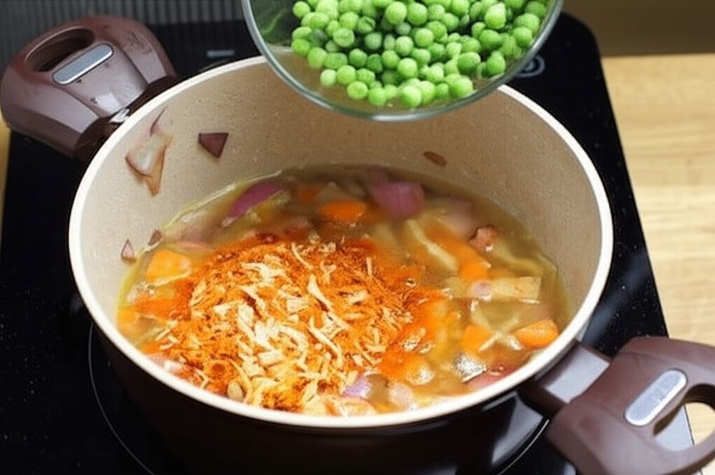 Wlej wodę, Fix Knorr oraz groszek. Zamieszaj i gotuj 5 minut na małym ogniu. Serwuj z pieczonymi ziemniakami i natką pietruszki.