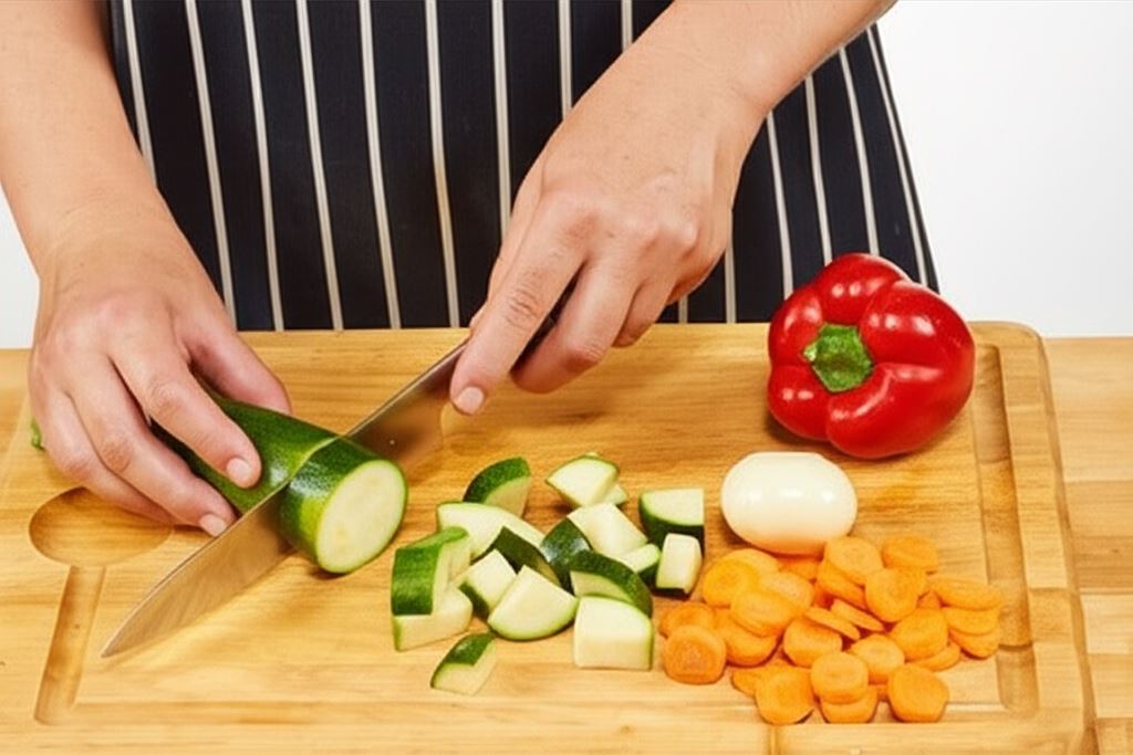 Potnij mięso w kostkę lub paski. Posiekaj drobno cebulę. Pokrój w kosteczkę cukinię i paprykę. Pokrój marchewkę w plasterki. Posiekaj natkę pietruszki.
