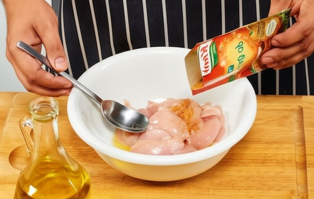 Potnij filety na paski. Połącz kawałki mięsa z Przyprawą do gyrosa Knorr oraz oliwą.