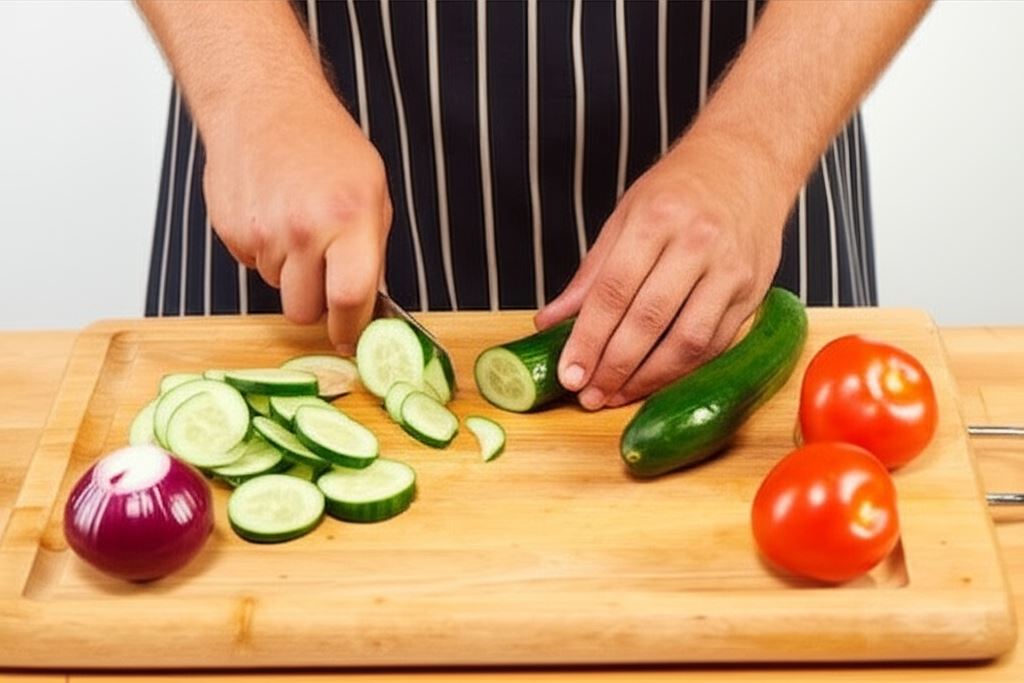 Pokrój na cienkie plastry cebulę i pomidory. Pokrój na plastry ogórki.