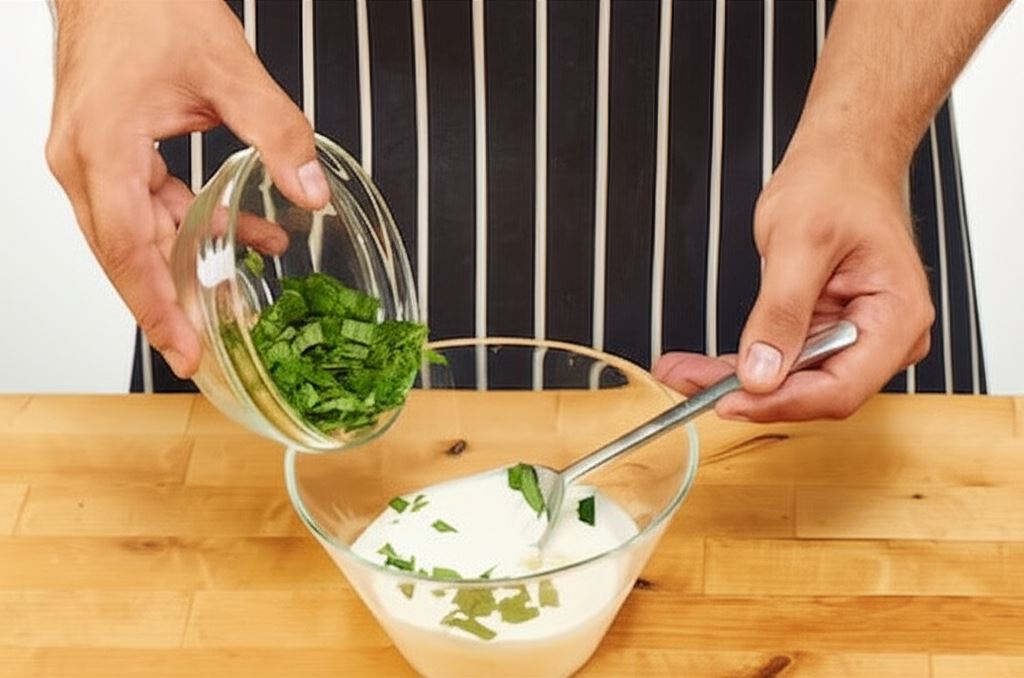 Posiekaj czosnek i miętę. Połącz jogurt z czosnkiem i miętą.