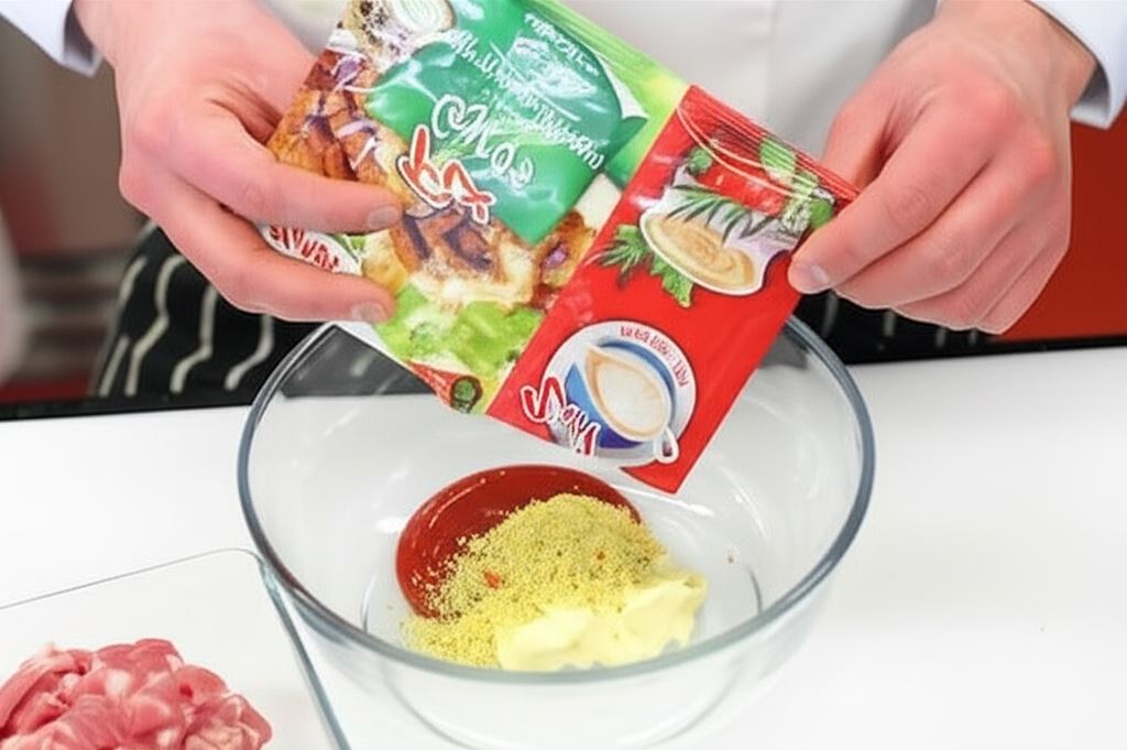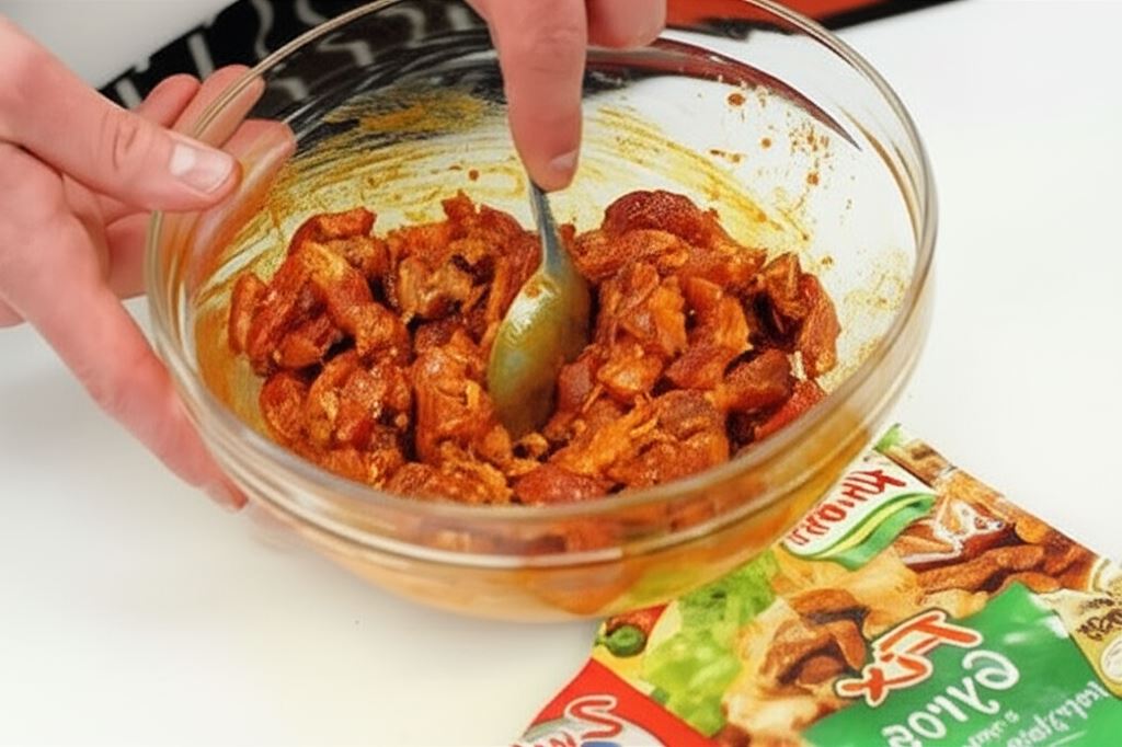 Karkówkę potnij na cienkie paski, wymieszaj z Fixem i trzema łyżkami oleju.