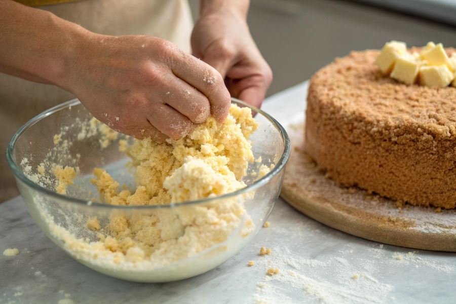 Zbyt długie wyrabianie ciasta na kruszonkę aktywuje gluten w mące, co prowadzi do utraty kruchości. Prawidłowa technika polega na szybkim połączeniu składników, najlepiej opuszkami palców lub widelcem, tylko do momentu uzyskania grudek o nieregularnej wielkości.