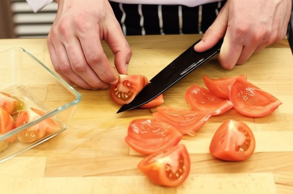 Pomidora podziel na cztery części. Wytnij gniazda nasienne i pokrój w kostkę.