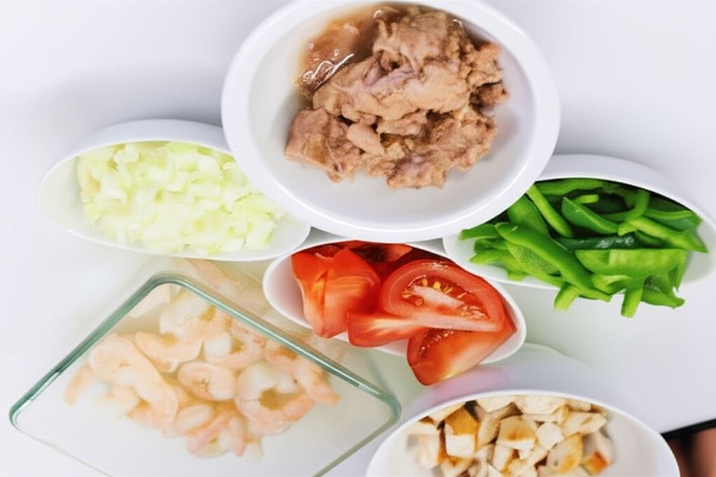 Papryki oczyść i potnij w paski, pomidory podziel na ósemki usuwając również nasady ogonków. Mięso kurczaka oddziel od skóry i kości, a potem pokrój w kostkę. Krewetki przepłucz zimną wodą i odsącz. Tak samo postąp z tuńczykiem. Cebule posiekaj w drobną kostkę.