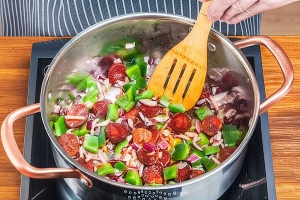 Posiekaj kiełbasę na grube kawałki lub talarki. Obsmaż wraz z posiekaną w kostkę cebulą i papryką.