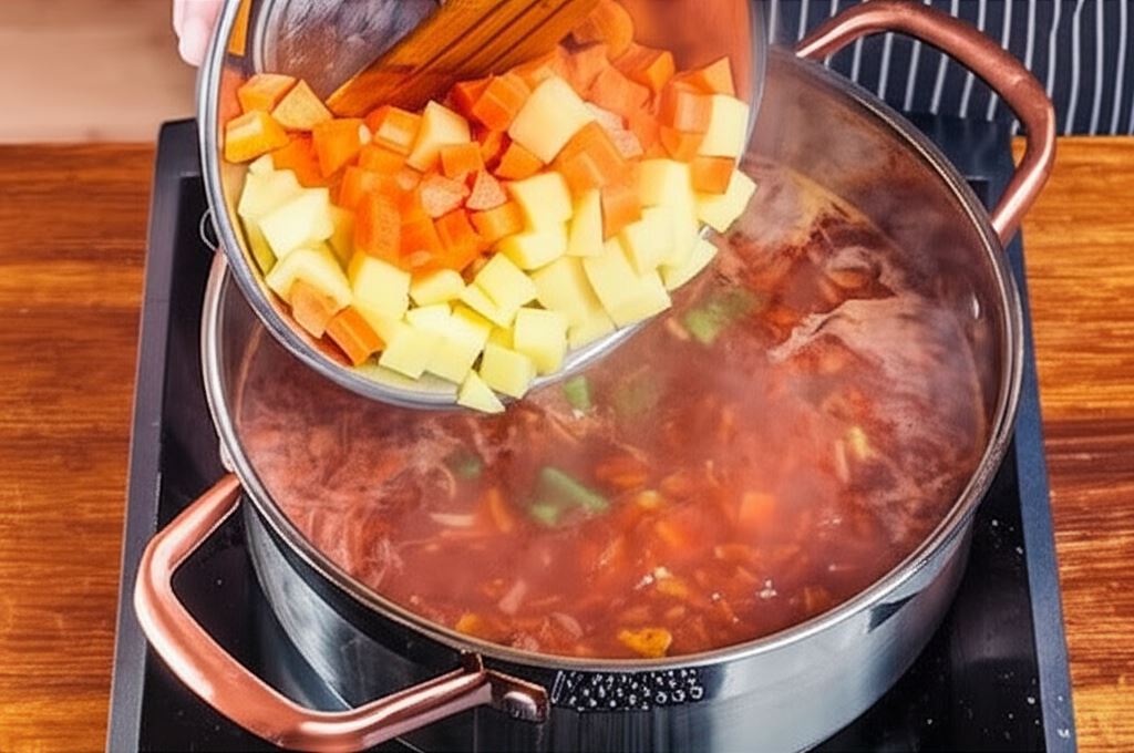 Wrzuć pokrojone w kostkę ziemniaki i marchewkę, a następnie gotuj na małym ogniu aż warzywa zmiękną.