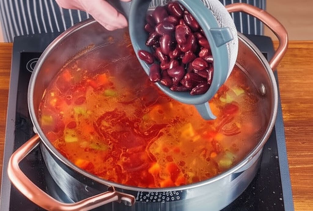 Dodaj odcedzoną fasolę, całość gotuj jeszcze przez około 10 minut aż zupa stanie się gęsta.