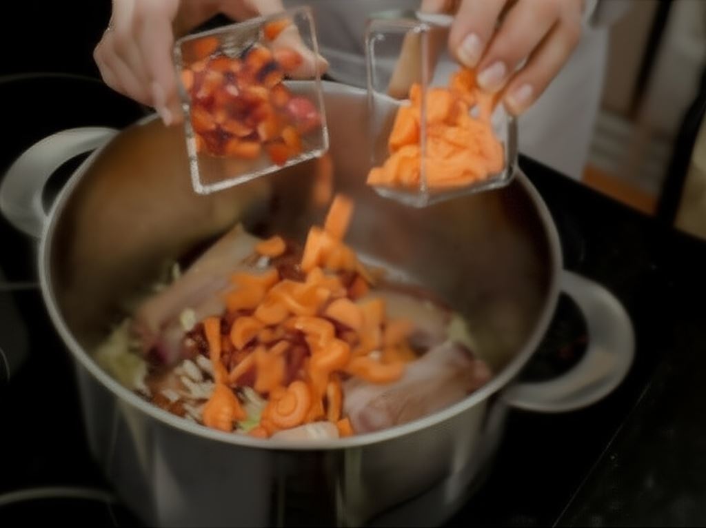 Podsmaż kiełbasę chorizo w tym samym garnku wraz z żeberkami. Potem pokrój marchewkę w półplastry, cebulę i paprykę w kostkę, a następnie dodaj je do mięsa.