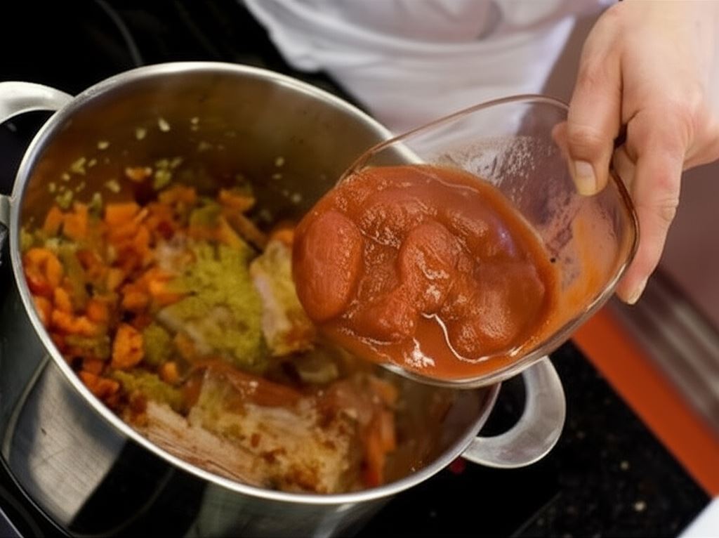 Smaż wszystko razem przez kilka minut. Wsyp przyprawy (paprykę ostrą, czosnek, kumin i kolendrę mieloną) oraz dodaj pomidory z puszki.