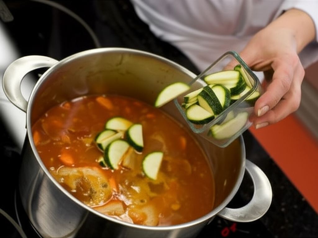Na koniec pokrój cukinię w półplastry, wrzuć do zupy i gotuj jeszcze tylko przez 5 minut. Ugotowaną zupę dopraw, jeśli trzeba, szczyptą soli do smaku.