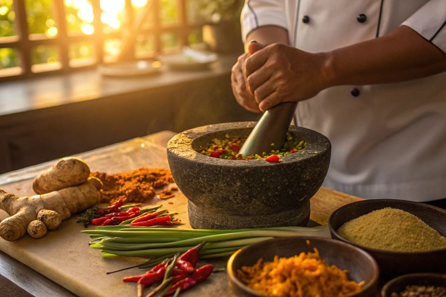 Zielona pasta curry – najostrzejsza, bazuje na świeżych zielonych paprykach chili i dużej ilości świeżych ziół. Proces przygotowania: