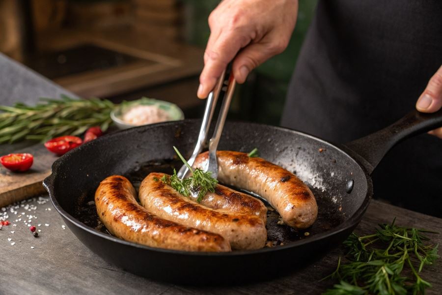 Dla wzbogacenia smaku kiełbasy, dodaj na patelnię pokrojoną w piórka cebulę gdy kiełbasa jest już w połowie usmażona. Cebula karmelizuje się, przejmując aromaty z kiełbasy, tworząc doskonały dodatek. Możesz również dodać świeży rozmaryn, tymianek lub majeranek w ostatnich 2 minutach smażenia, co nada potrawie wyrazistego aromatu.