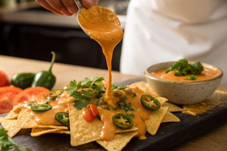 Dla osób na diecie roślinnej, wegański sos nacho może być równie kremowy i satysfakcjonujący. Podstawą jest substytut sera na bazie:
