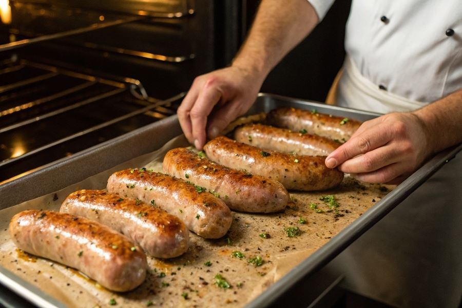 Przed pieczeniem kiełbasę należy nakłuć w kilku miejscach, co zapobiega pękaniu osłonki podczas obróbki termicznej. Dla kiełbas wędzonych wystarczy krótszy czas pieczenia – około 20 minut w temperaturze 170°C, ponieważ proces wędzenia częściowo już je obrobił termicznie.
