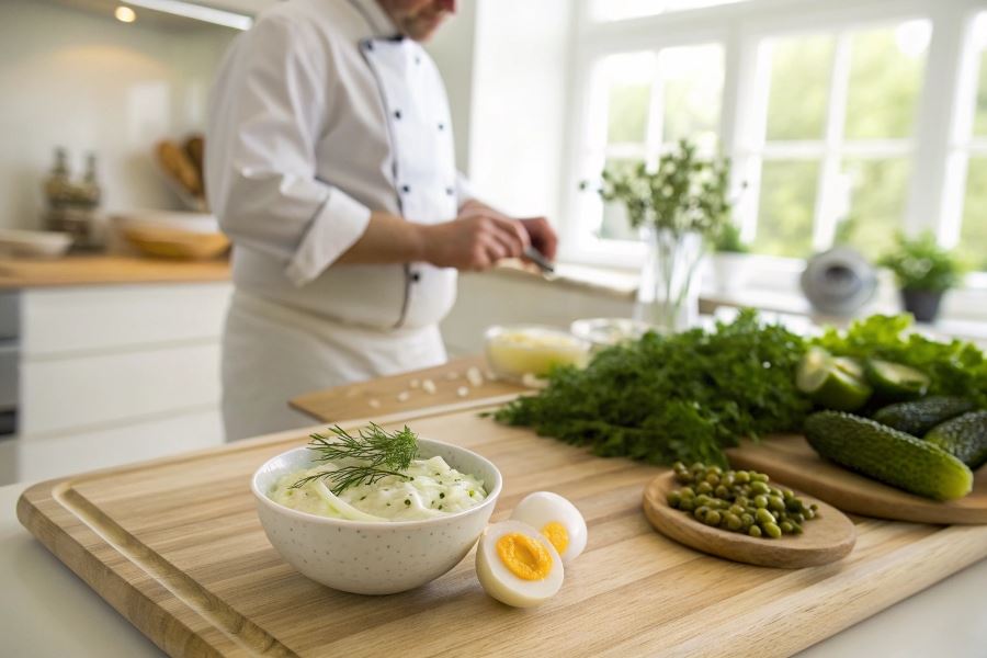 Sekret idealnego sosu tatarskiego tkwi w równowadze między kwaskowatością ogórków a kremowością majonezu.
