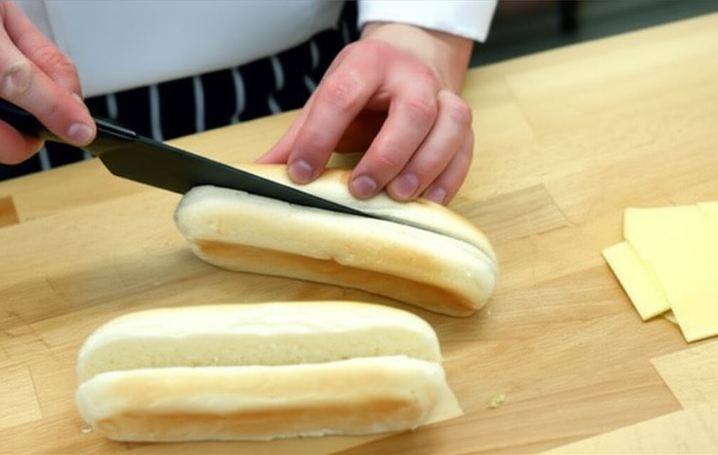 Przekrój bułki wzdłużnie na połowę, nie rozcinając ich całkowicie.