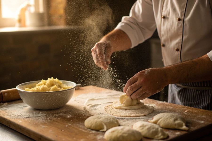 Podczas lepienia pierogów z nadzieniem ziemniaczanym stosujemy technikę „mokrego brzegu” – delikatnie zwilżamy obwód kółka, co zapewnia idealne sklejenie. Nadzienie (około łyżki) umieszczamy centralnie, a następnie składamy ciasto na pół, dokładnie zlepiając brzegi i formując charakterystyczną falbankę.