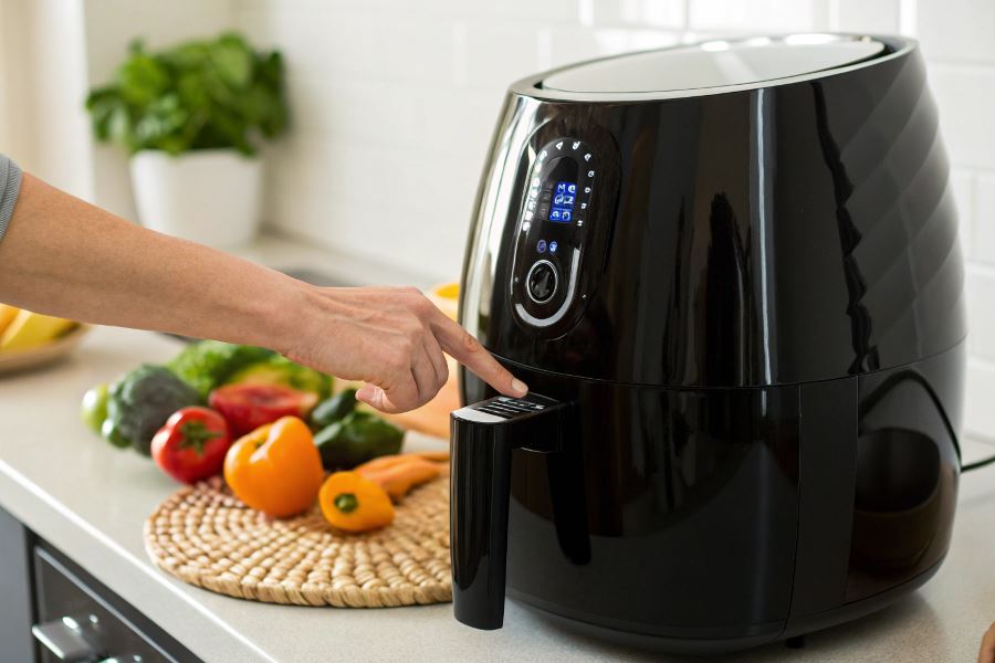 - Zaprogramuj czas smażenia za pomocą panelu sterowania (większość modeli posiada intuicyjne pokrętło lub przyciski +/-)