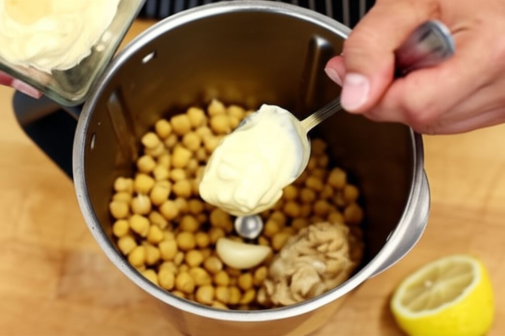 W naczyniu miksera umieść groch (zachowaj kilka ziaren do dekoracji), czosnek, pastę tahini i harisy, majonez oraz sok z cytryny. Wszystko zmiksuj na gładką masę. Dodanie majonezu do pasty sprawi, że będzie ona bardziej aksamitna w smaku.