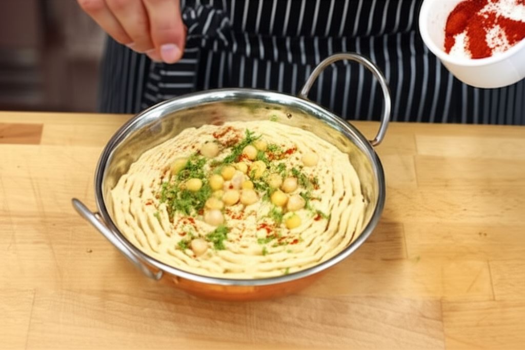 Przed serwowaniem hummus polej kilkoma łyżkami oliwy, posyp na wierzchu odrobiną słodkiej wędzonej papryki w proszku i przyozdobij kilkoma odłożonymi wcześniej ziarnami ciecierzycy.