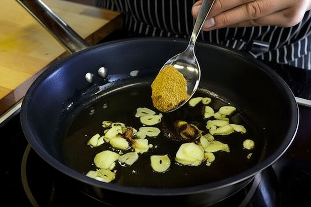 Czosnek pokrój na plasterki i przysmaż na oliwie. Wsyp kmin i gałkę muszkatołową i podsmażaj przyprawy przez moment.