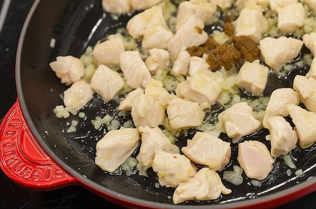 Kurczaka pierś pokrój w kostkę, posiekaj cebulę i czosnek. Rozgrzej oliwę na patelni i podsmaż czosnek, cebulę oraz kurczaka – pod koniec dodaj curry pastę i smaż razem jeszcze moment.