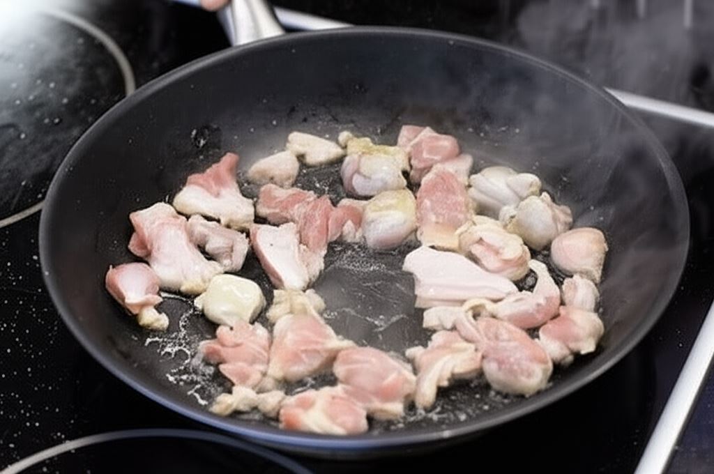 Podziel kurczaka na kawałki i obsmaż na gorącym oleju.