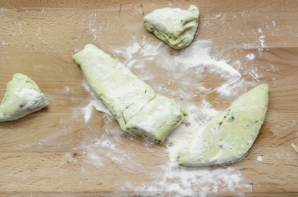 Po upływie tego czasu ciasto przenieś na stolnicę i rozdziel na mniejsze porcje.