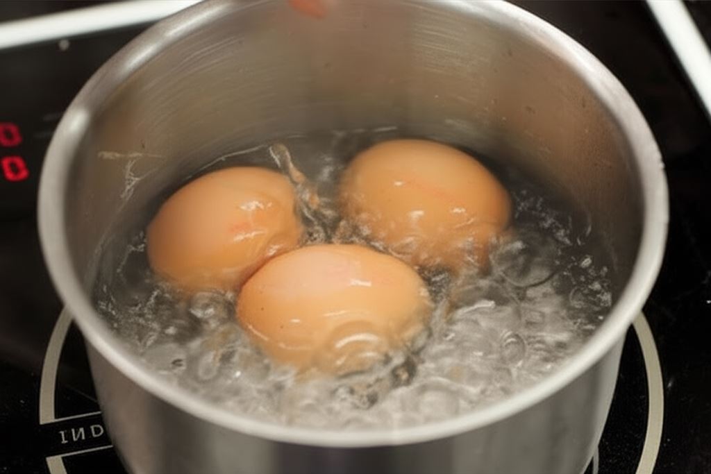 Jajka gotuj na twardo przez 8 minut od momentu wrzenia wody. Dodaj sól do wody.