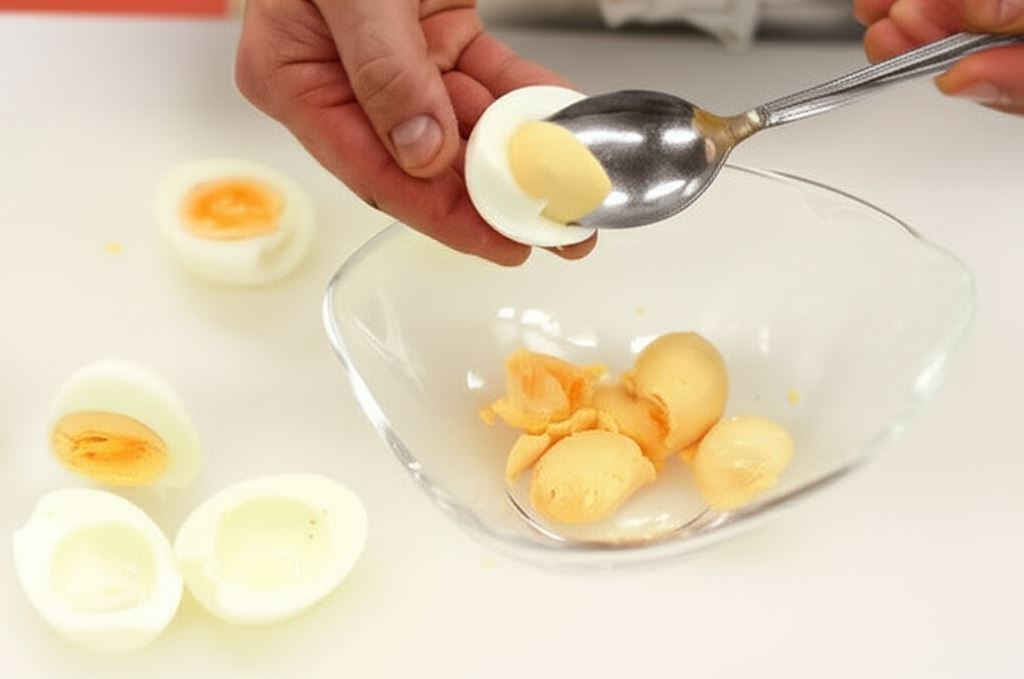 Po ugotowaniu jaja ostudź, następnie obierz, przekrój na połowę i wyciągnij żółtka.