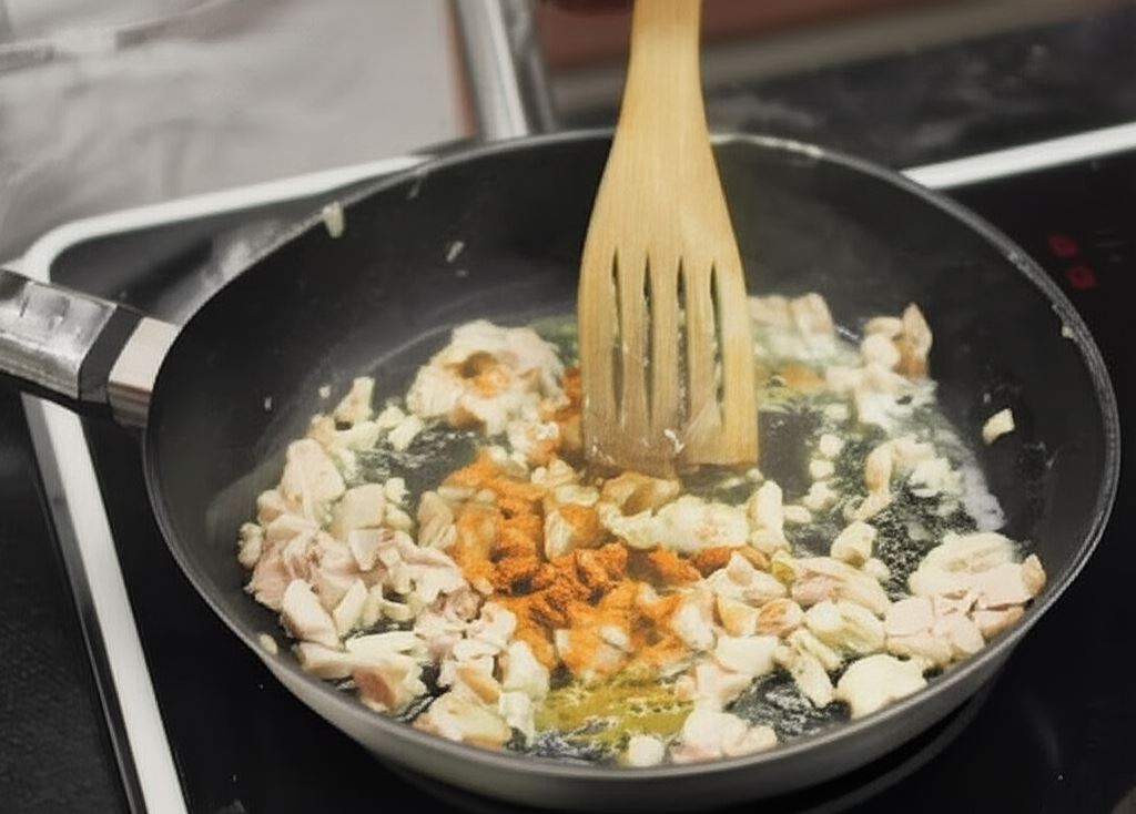 Roztop masło na patelni, wsyp pokruszone mięso z rosołu i przyprawę Knorr. Smaż przez parę minut.