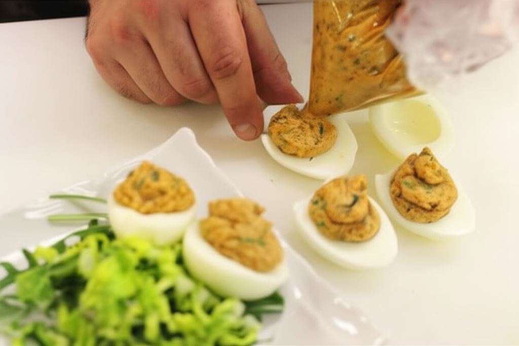 Jaja faszerowane to prawdziwa perełka polskiej kuchni – proste w przygotowaniu, a jednocześnie niezwykle smaczne. Ugotowane na twardo jajka, przekrojone na pół i wypełnione aromatyczną pastą z mięsa z rosołu, żółtek i majonezu, to propozycja, która zachwyci każdego. Delikatny smak jajek doskonale komponuje się z wyrazistym nadzieniem, a całość udekorowana natką pietruszki i kaparami prezentuje się niezwykle elegancko.