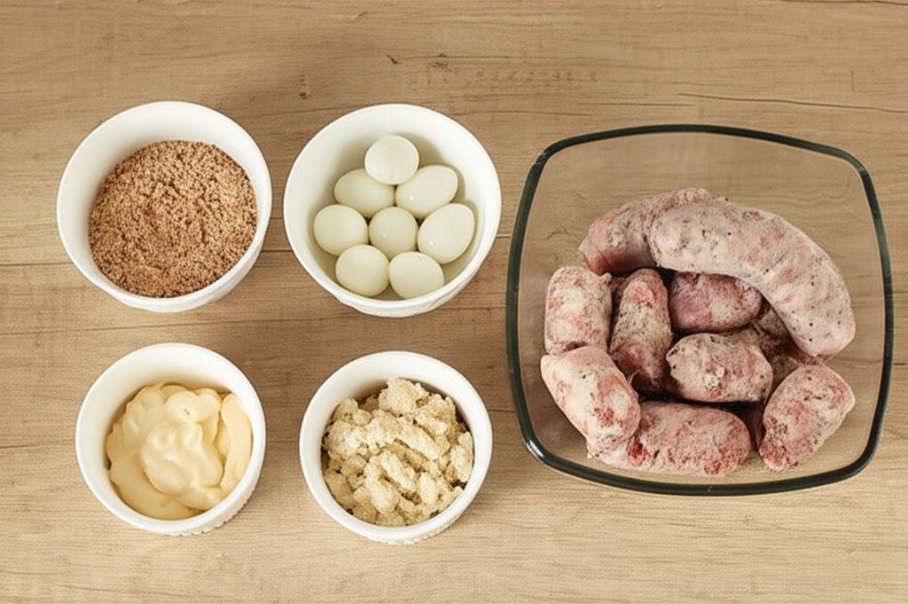 Jaja w szkockim stylu z białą kiełbasą i chrzanem
