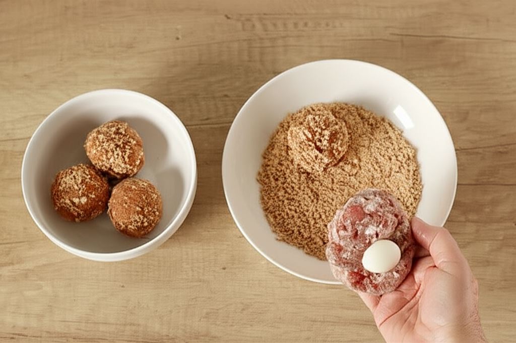 Zanurz jajko w porcji mięsa i uformuj kulę, dbając o to, by mięso całkowicie otuliło jajko. Kulę obtocz w panierce Knorr. Przed obtaczaniem każdej kuli zmocz dłonie – panierka wówczas lepiej przylgnie do mięsa.