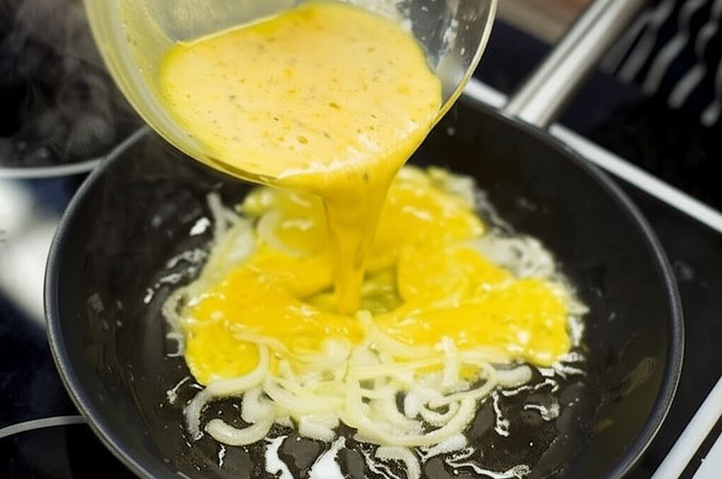 Zeszklij półplasterki cebuli na oliwie. Dodaj jajeczną masę i brokuły. Mieszając cały czas, smaż aż jaja się zetną.
