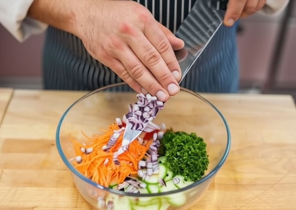 Przygotuj sałatkę. Ogórka potnij w plasterki. Cebulę posiekaj w drobną kostkę. Natkę drobno pokrój. Marchewkę zetrzyj na tarce o grubych oczkach. Pomidorki przetnij na pół lub na ćwiartki. Wszystkie składniki złącz. Skrop olejem. Zamieszaj i przypraw czarnym pieprzem.
