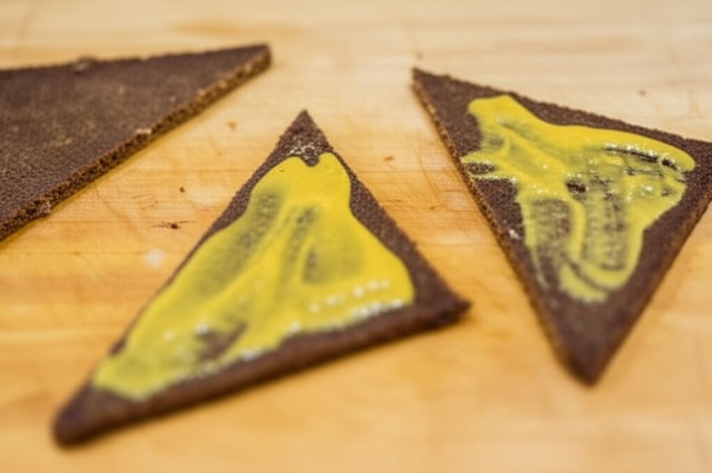 Sporządź tosty. Pumpernikiel podziel na trójkąty. Posmaruj musztardą z miodem. Zapiecz. Jajecznicę nałóż na tosty. Udekoruj kiełkami.
