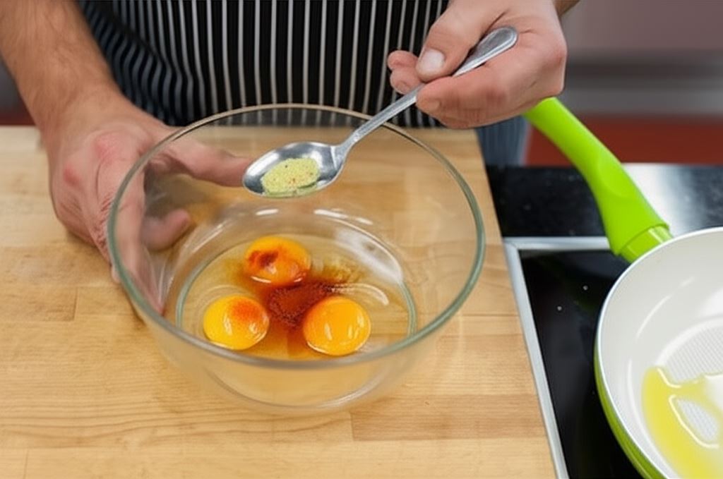 Podgrzej oliwę na patelni. Jajka ubij z papryką słodką i przyprawą Delikat uniwersalną. Usmaż. Serwuj z sałatką z warzyw.