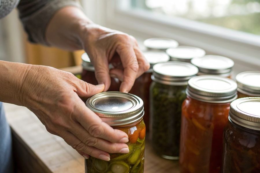 Najprostszym sposobem sprawdzenia szczelności jest delikatne naciśnięcie środkowej części wieczka. W prawidłowo zawekowanym słoiku wieczko pozostanie wklęsłe i nie ugnie się pod naciskiem. Jeśli natomiast wieczko poddaje się naciskowi lub „klika”, oznacza to brak próżni i nieprawidłowe zawekowanie.