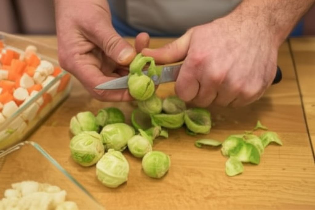 Marchewkę, pietruszkę, ziemniaki i seler obierz, pokrój w kostkę 2 cm. Z brukselki zdejmij zewnętrzne liście, natnij ją lekko nożem na krzyż od strony głąba. Kalafiora podziel, wycinając z niego drobne różyczki. Następnie oczyść i przetnij na trzy części fasolkę szparagową, posiekaj natkę koperku.