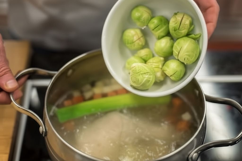 Do gotującego się mięsa wsyp marchew, seler, pietruszkę, ziemniaki oraz całego pora i przepołowioną cebulę. Zupę z warzywami gotuj 20 minut, następnie dodaj brukselkę, fasolkę szparagową oraz przyprawy, ziele angielskie, liść laurowy i ziarna pieprzu. Wszystko razem gotuj około 5 minut, a potem dodaj kalafiora. Zupę z dodanym kalafiorem gotuj jeszcze przez 5 minut.