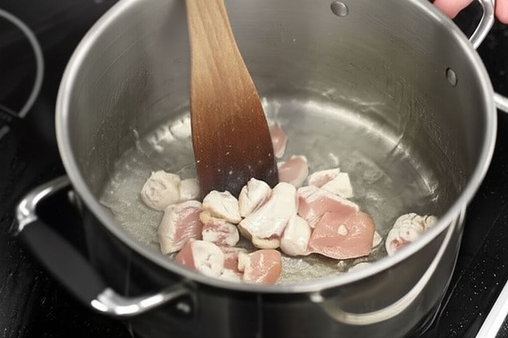 Filety z kurczaka pokrój w małą kostkę i obsmaż w garnku na rozgrzanej oliwie.