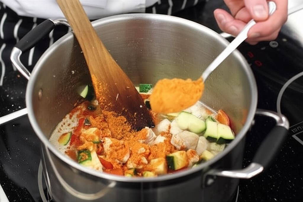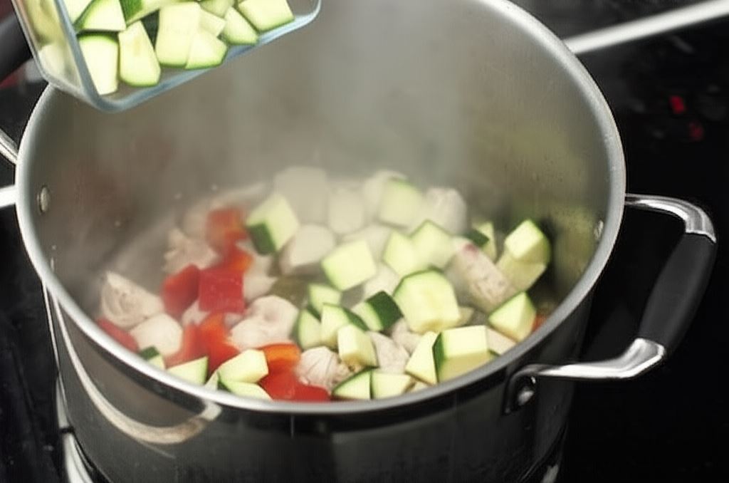 Pokrój cukinię i paprykę w kostkę, następnie dodaj do kurczaka. Razem smaż przez moment.